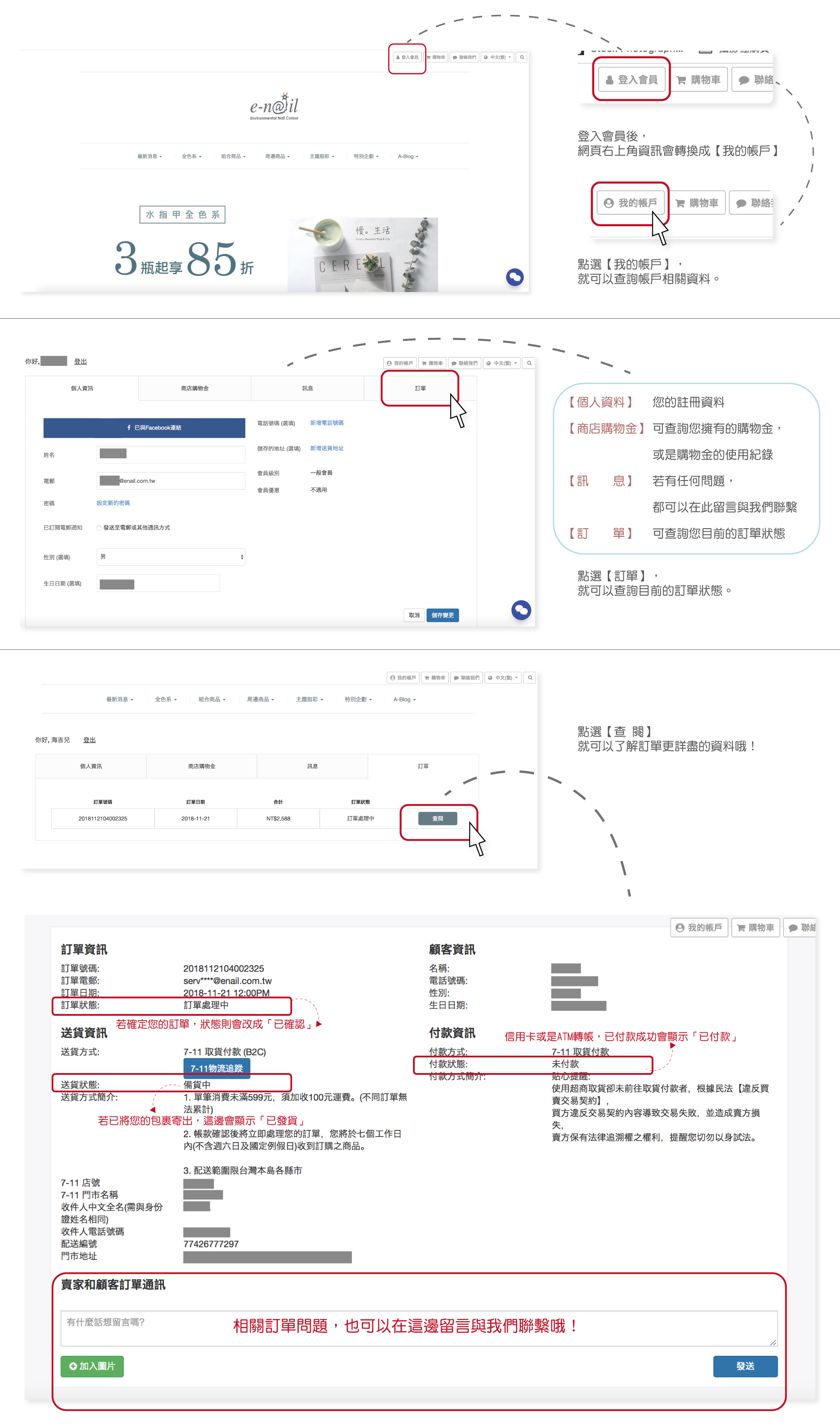 【登入會員】後,可於官網右上角看到【我的帳戶】,請點選【訂單】,即可查看訂單處理進度。